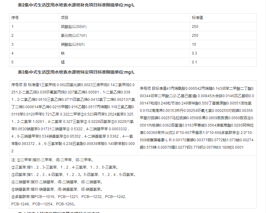 集中式生活飲用水地表水源地水質評價的項目應包括表1中的基本項目、表2中的補充項目以及由縣級以上人民政府環境保護行政主管部門從表中選擇確定的特定項目。