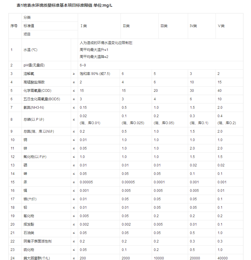 對應地表水上述五類水域功能,將地表水環境質量標準基本項目標準值分為五類,不同功能類別分別執行相應類別的標準值。水域功能類別高的標準值嚴于水域功能類別低的標準值。同一水域兼有多類使用功能的,執行最高功能類別對應的標準值。實現水域功能與達功能類別標準為同一含義。