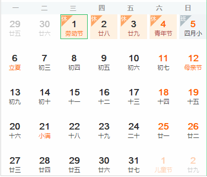 2019年勞動節(jié)放假通知安排如下:2019年5月1日至4日放假調(diào)休,共4天。4月28日(星期日)、5月5日(星期日)上班。