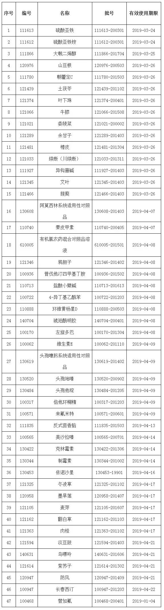 ? ? 2018年第十一期國家藥品標準物質供應新情況,包括47個即將換批品種的預計上市時間、47個即將失效品種的有效使用期限和2個停用品種名單。 即將換批的品種 即將失效的品種 近期停用的品種 ? ?對于有效使用期限外的標準物質以及未規定有效使用期限的非最新批次標準物質(一般指在國家藥品標準物質供應目錄中不收載的老舊批次),中檢院將不再對其進行質量監測,用戶如若繼續使用,其特性量值及適用性請自行驗證